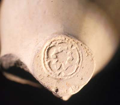 Thistle/Tulip Relief. Stamped on heel with circular pearled bordering. Stem bore size: 7/64ths. Pipe fragment consists mostly of stem and heel, but origin very likely Dutch. John H. McCashion identifies similar mark as a Dutch thistle (1635-45). Duco (1981) gives several examples called tulip and leaves (1655-70). Oswald (1969:141) dates this Dutch mark from 1630-70.