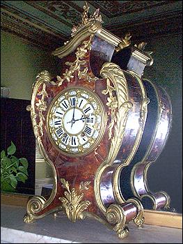 Among these are two games tables and a loo or round pedestal table. The tortoise-shell clock on the mantel is likely French and may date from the first half of the 19th century.