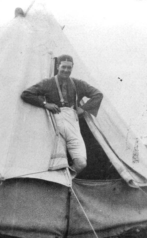 Paquetage et matériel devant une tente. Le nom de Chas. R. Ayre est inscrit sur un paquetage. Une personne sous la tente est à peine visible.